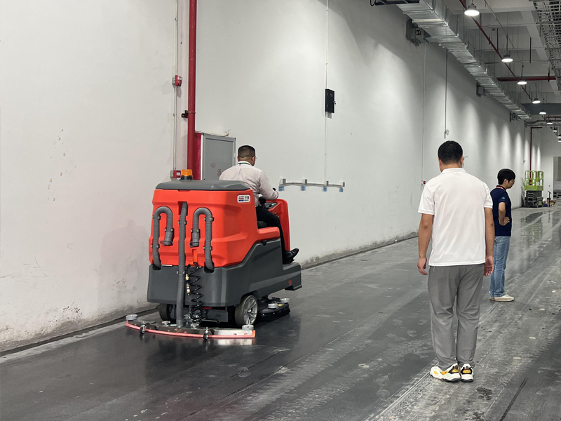 The underground garage also spans a vast area with a complex layout, including a special terrain configuration featuring an S-curve connecting to a steep ramp. Conventional large scrubbers struggle with such conditions due to insufficient steering flexibility and inadequate climbing power, making comprehensive and efficient cleaning impossible and failing to meet strict cleanliness standards before the garage's opening. Based on these extensive cleaning requirements for both workshop and garage, Foshan Kuang-Chi specified the need for large floor scrubbers of the same model, with a mandatory cleaning and water absorption width of at least 1.2 meters to ensure efficient, deep cleaning of large areas.